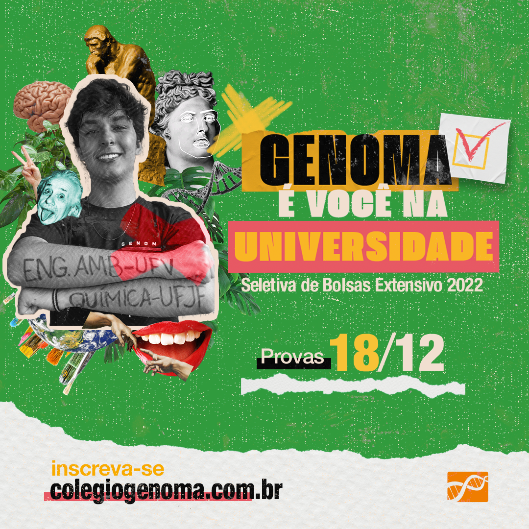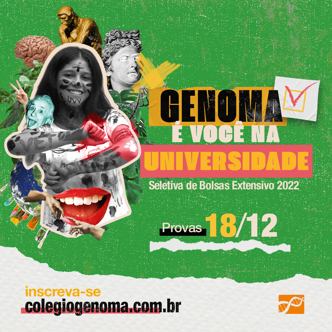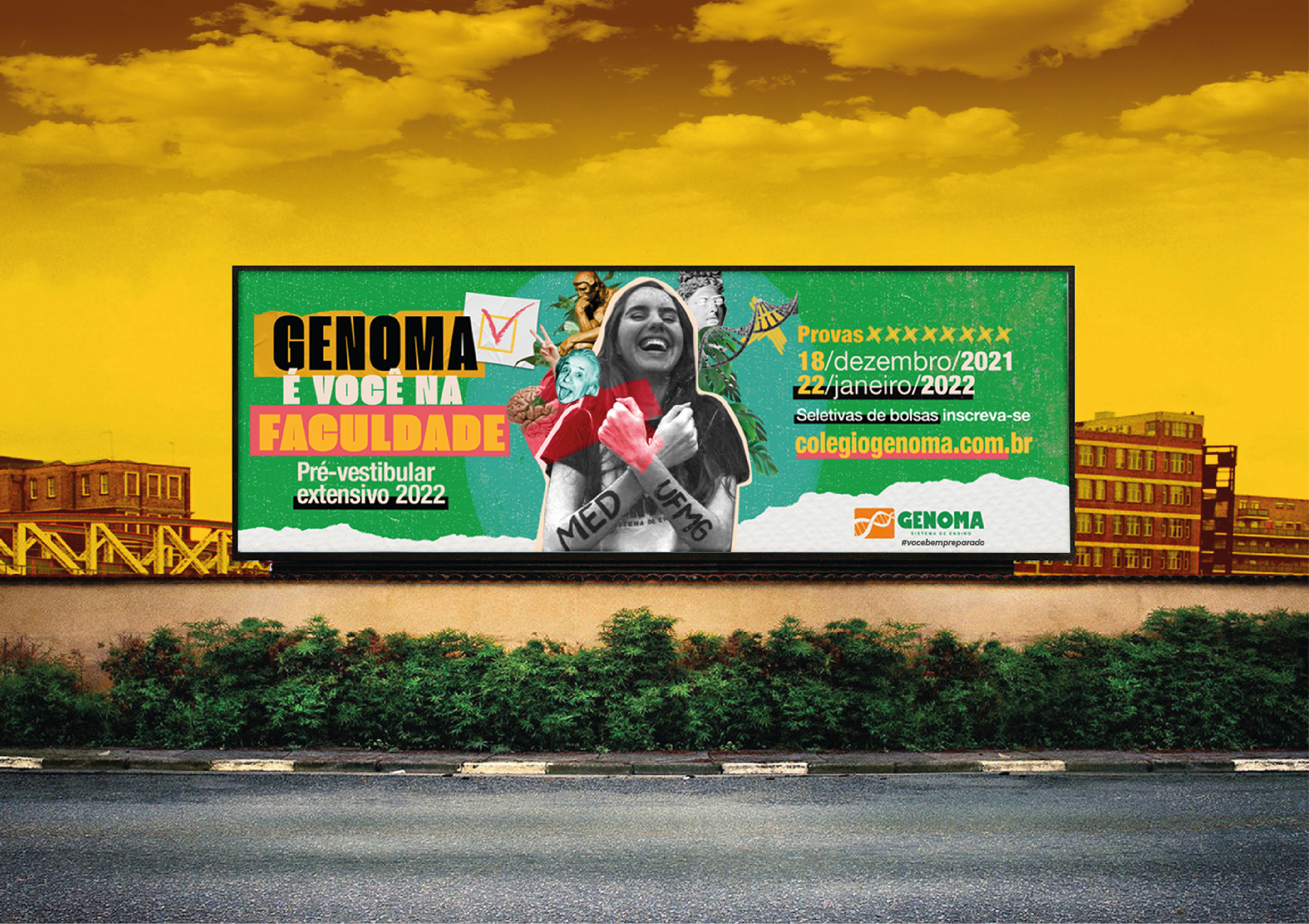 GENOMA: É VOCÊ NA FACULDADE, traz a confiança necessária para alcançar o objetivo final que é passar. Para a campanha utilizaremos a técnica de colagem, vamos brincar com os elementos, onde em uma peça conversando com a outra mostraremos que o Genoma está apto a ser o melhor caminho na hora de decidir onde se preparar para as provas. O mote passará uma mensagem de que vamos estar do inicio ao fim com os nossos alunos, onde o conhecimento adquirido nas aulas refletirá nas provas.