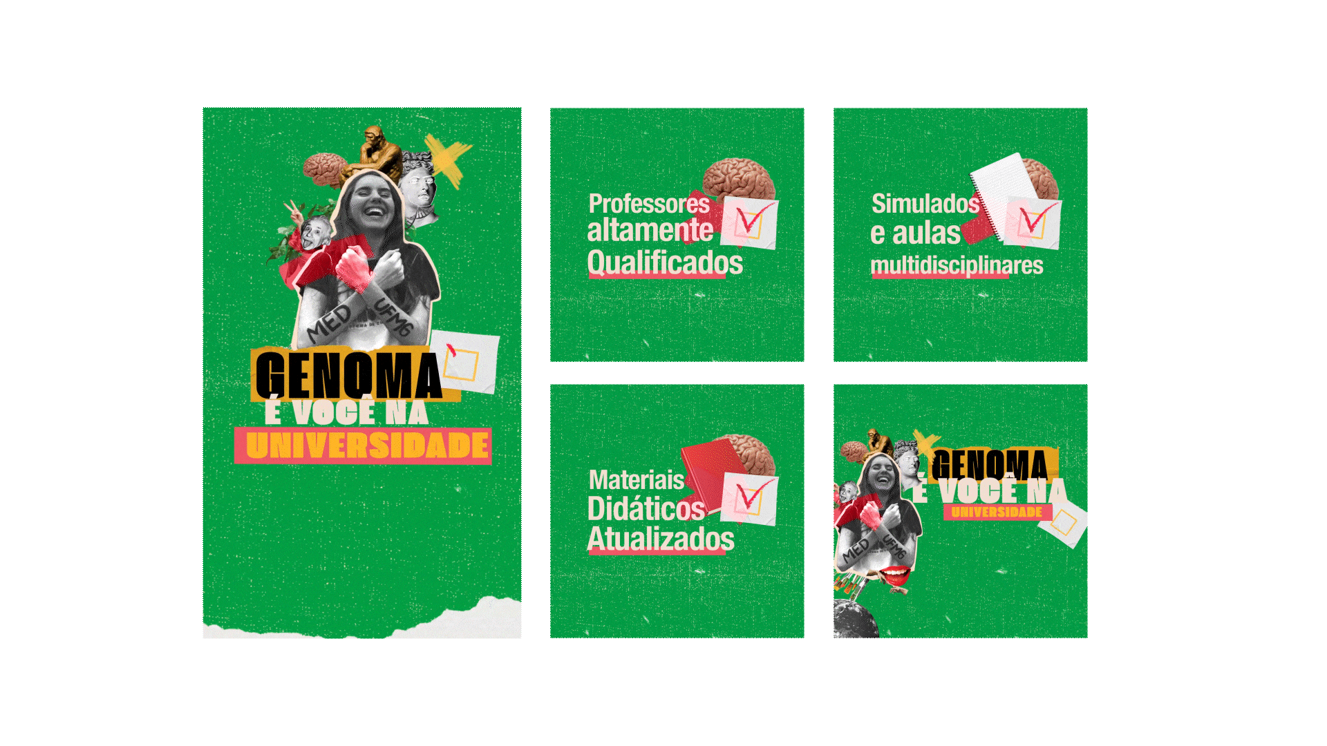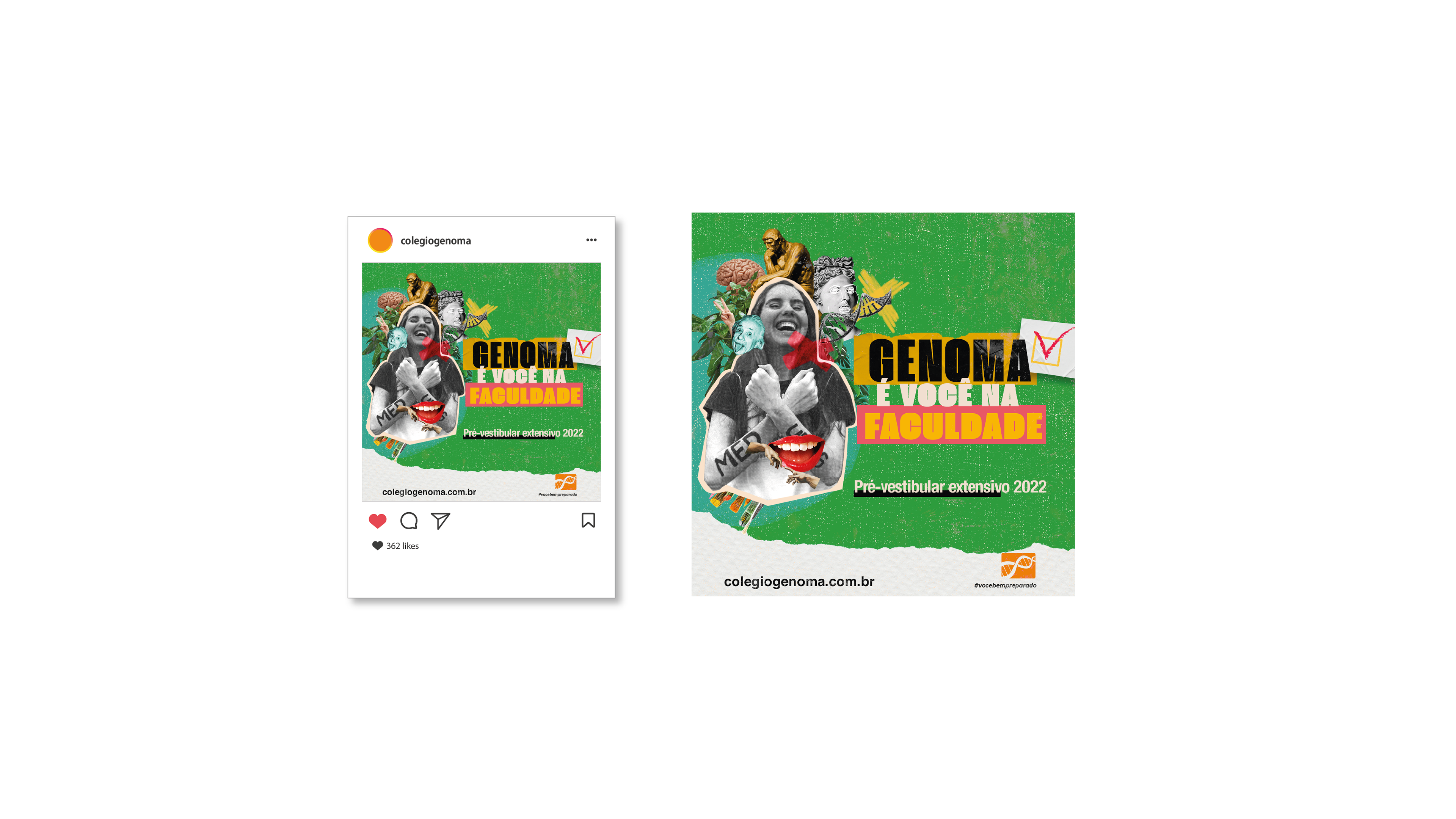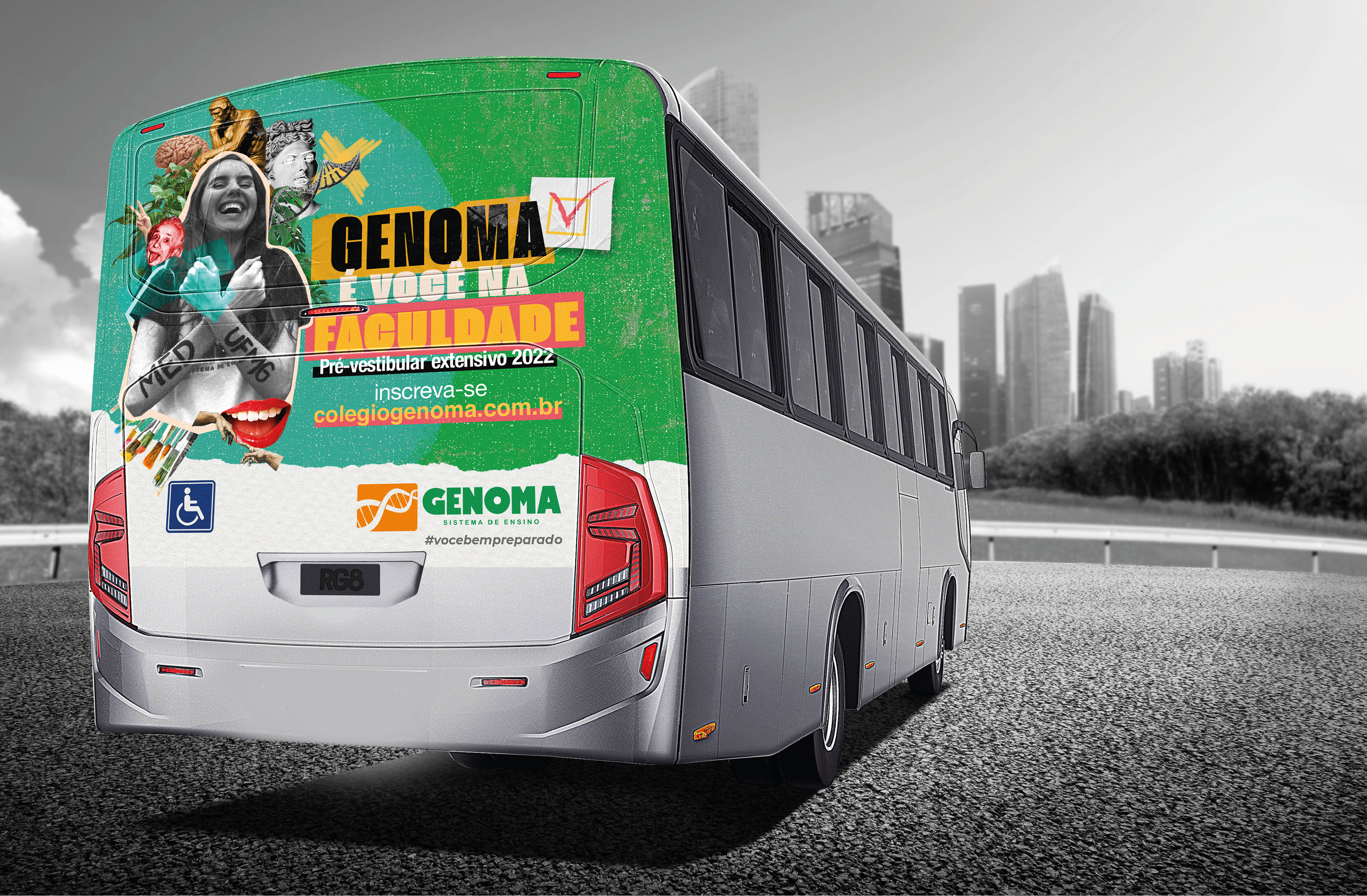 GENOMA: É VOCÊ NA FACULDADE, traz a confiança necessária para alcançar o objetivo final que é passar. Para a campanha utilizaremos a técnica de colagem, vamos brincar com os elementos, onde em uma peça conversando com a outra mostraremos que o Genoma está apto a ser o melhor caminho na hora de decidir onde se preparar para as provas. O mote passará uma mensagem de que vamos estar do inicio ao fim com os nossos alunos, onde o conhecimento adquirido nas aulas refletirá nas provas.